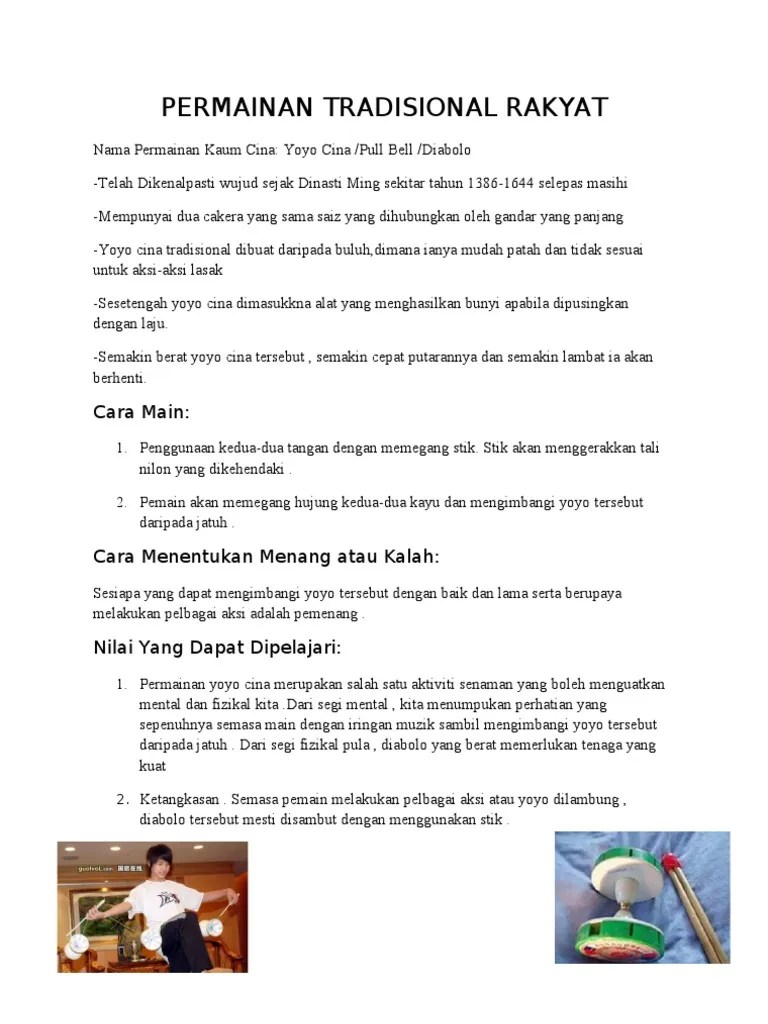 Performed at pesta konvo ukm 38. I) mainan dari china yang terdiri daripada dua cakera yang sama saiz disambungkan dengan gandar yang panjang. Permainan ini telah wujud sejak . Secara tradisional, yoyo cina diperbuat daripada buluh, tetapi buluh . Permainan tradisional rakyat cina yang boleh menyatukan rakyat malaysia.